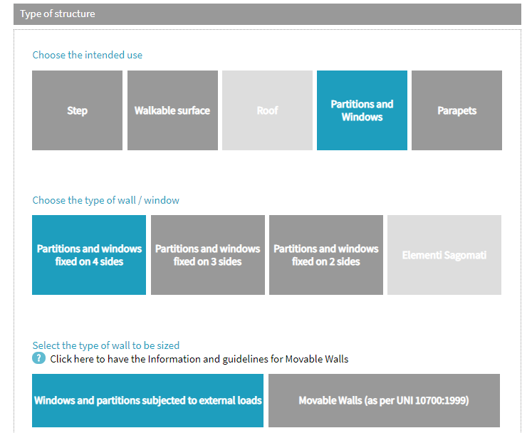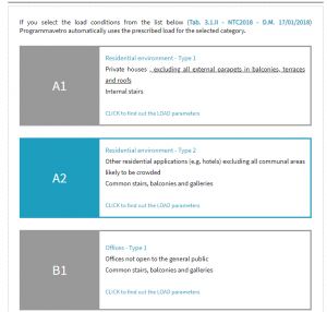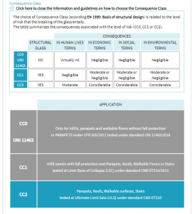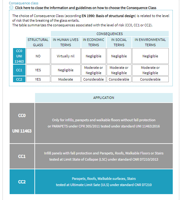 To define the most suitable layers for any laminated glass you must first of all choose one of the three available categories (in compliance with table 3.1.II of Italian Ministerial Decree 17/01/2018 – NTC 2018), as well as the place where the glass will be installed, after which the program will automatically use the correct load values prescribed by law.