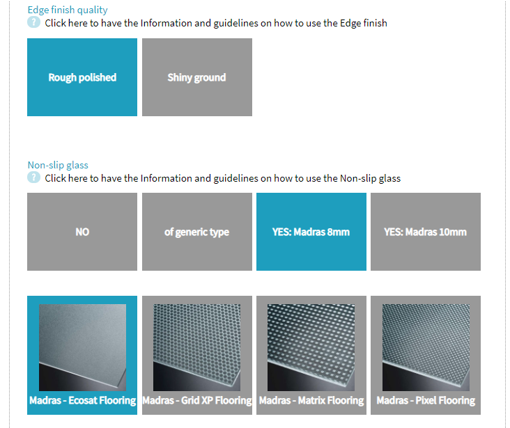 No need to navigate your way through numbers, graphs or coefficients: the program comes up instantly with a range of the best laminating options for you to choose the one most advantageous to you and to your customer. ProyectoVidrio helps you find the perfect combination of glass modules with continuous support for: walkable floors, stairs, roofs, windows, movable walls, and floor-mounted balustrades.