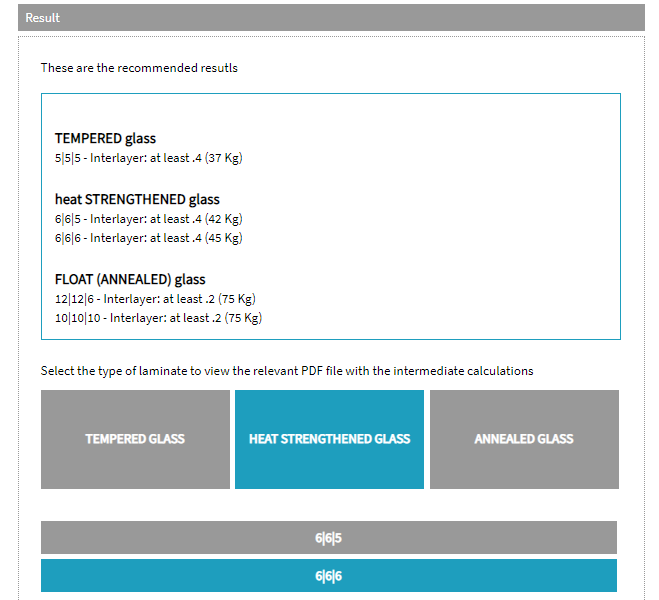 The calculation result provided by ProyectoVidrio is a data sheet containing the various laminating solutions for the desired application using three glass types: tempered, heat strengthened and annealed.